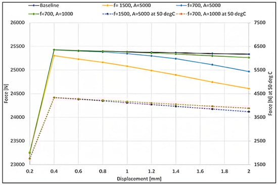 Figure 11 presents the effect of oscillation waves with various amplitudes and frequencies, as well as an increase in joint temperature, on the disassembly force. The results related to the thermal effect are plotted with respect to a secondary axis to the right. The baseline model required a disassembly force of approximately 25.4 kN. The application of a vibration wave with an amplitude of 1000 N and a frequency of 700 Hz did not have a significant effect. However, when either the amplitude or frequency was increased, the driving force was shown to decrease, particularly with increased displacement. For example, when a vibration wave with an amplitude of 5000 N and a frequency of 1500 Hz was applied, the breaking force at a displacement of 2 mm was about 24.6 kN. These findings are consistent with previous experimental studies that suggest that the driving force level can be controlled by changing the vibration amplitude or frequency [3,21]. Higher frequencies are thought to have a greater impact on elastoplastic deformation and surface roughness, resulting in a reduced friction force and thus a decrease in the required disassembly force.