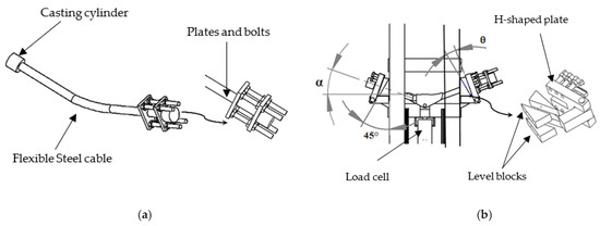 The suspension clamp testing device comprises a suspension clamp holder tool and a support block assembly. The clamp holder includes a steel cable and two steel plates at one end, joined together by four bolts, the objective of which is to assist in fine adjustments to precisely attain the value of the clamp dangle angle. At the steel cable’s ends, cylindrical tin-cast blocks anchor onto the support blocks placed on the machine’s exterior web profile during the test performance. It is necessary to use steel cable for the test to emulate the force-stress of the line and the suspension clamps during their operation, according to the study performed in the investigations [17,18].