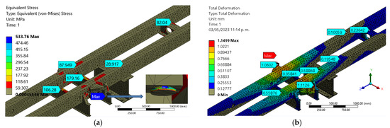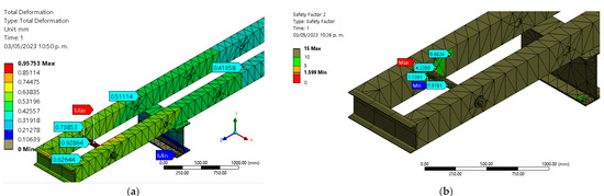 Figure 9a,b shows the deformations on the Z = 0.347 mm and X = 0.9907 axes. As expected, the X-axis value is the largest and is very close to the total deformation. According to these values, integrating the device into the HTM to test the suspension clamps does not affect the structural integrity.