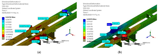 Directional deformation values: (a) Z axis; (b) X axis, for suspension clamp device.