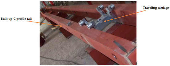 The structure consists of rails comprising two C-profile types (CE) welded on the flange side, with a total length of 17.5 m for a 1.5-m stroke length. The rails rest on 18″ × 7 1/2″ IPR profiles, with a group brace length of 3000 mm. The rails have 80 mm-diameter through holes drilled 1 m apart and placed on the web profile side, aiming to anchor the carriage using the bushings and the bar.