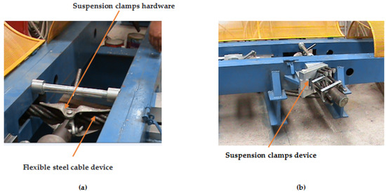 View of HTM: (a) suspension clamp hardware; (b) flexible steel cable device.