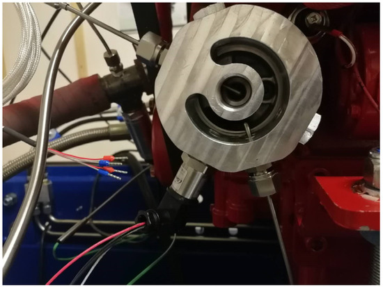 The lubrication oil filter keeps the oil clean and ensures the lubrication performance to extend the life of critical friction pairs. In practice, external elements, such as water, dust and particles, and oil oxide, will cause the blocking of the filters. When a filter blockage fault happens, insufficient lubrication oil is circulated into the engine, decreasing the performance of the marine engine. A direct consequence of filter blocking is a drop in the lubrication oil pressure. Two strategies are used to simulate this fault on the marine engine test rig. As can be seen in Figure 4, a circular device is designed to guide the oil flow and provide space to control the oil volume. The oil will circulate from the cooler into the circular passage and then enters the engine from the central hole. On the one hand, the circular holes on the cover are partially blocked manually. On the other hand, the hole size at the center is adjusted and reduced by additional bolts. The oil pressure is measured after the clog and the tests are conducted at around 1300 RPM.
