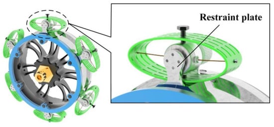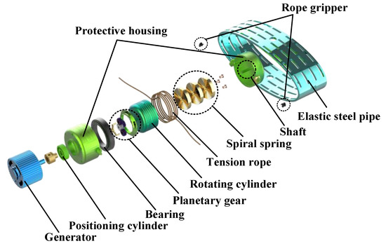 As illustrated in Figure 1, the primary components of the NEH-TPMS are an elastic steel pipe, tension rope, generator, protective housing, rotating cylinder, planetary gear, positioning cylinder, coupling, four-point contact ball bearings, shaft, and spiral spring. The NEH-TPMS is mounted between the wheel hub and the tire’s inner surface. Six sets of restraint plates are attached to the hub’s outer surface. As indicated in Figure 2, the protective housing is attached between two restraint plates. A dowel pin connects one end of the elastic steel pipe to the outer surface of the hub and the other end to the inner surface of the tire. The shaft is fixedly attached to the middle of the rotating cylinder, with tension ropes wound around the outside. The ends of the rope slide through the protective housing and are fixed to the ends of the elastic steel pipes. One end of the spiral spring is attached to the exterior of the rotating shaft, while the other end is attached to the interior of the rotating cylinder. The positioning cylinder is inserted into the inner ring of the four-point contact ball bearing. One end of the positioning cylinder is linked to the generator, while the other end is fastened to the central gear output shaft of the planetary gear.