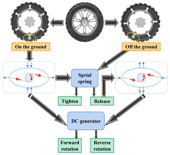This section presents a detailed analysis of the device’s movement process, which comprises four key components. Mathematical models have been developed to facilitate quantitative analysis of each component. The first section focuses on the tire deformation model, which explains how the tire gets distorted immediately after it comes into contact with the ground. The second section deals with the process of converting the linear motion of the tire into the rotating motion of the transmission mechanism, involving the storage of energy by spiral springs. The generation of generators is discussed in the third section. The fourth section involves the regulation of the generator’s raw voltage to direct current, followed by the charging of the battery and storage of electrical energy. Through the construction of the mathematical models described above, it becomes possible to gather crucial evaluation data such as the device’s generation capacity and energy storage efficiency.