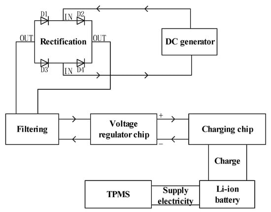 The flexibility of the spiral spring increases the take-up and take-down effect of the tension rope, hence enhancing the energy collection efficiency. The generator’s sinusoidal electricity is rectified to produce a sinusoidal waveform in the same direction. After passing through an inductor and capacitor for filtering, a waveform with less voltage variation is obtained. The filtered signal is routed into the voltage regulator chip to generate direct current, which is then connected to the charging chip to charge the battery and store the power. This helps to meet the power requirements of the in-tire sensors for data transfer in real-time and provides real-time power to the sensor when the tire stops rotating. This prevents the sensor from being without power for extended periods, allowing it to continuously monitor the tire’s condition for longer periods. The circuit processing flow is shown in Figure 4.