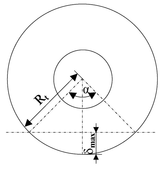 Using the geometric relationship depicted in Figure 5, the circumferential angle corresponding to the length of the tire’s contact surface with the ground can be expressed as follows: