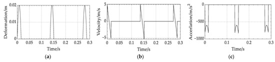 Simulation results for tire deformation model: (a) Relationship between tire deformation variables and time; (b) Relationship between tire deformation speed and time; (c) Relationship between tire deformation acceleration and time.