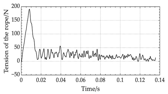 The relationship between the tension of the rope and time is shown in Figure 8. In 0.008 s, the tire deformation reaches its maximum value. Thus, the rope’s pulling force grows first and reaches a maximum of 190.8 N. The following expression is given: