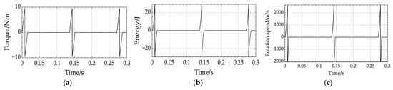 Simulation results of the torque transfer and spiral spring energy storage model: (a) Relationship between torque and time; (b) Relationship between spiral spring energy and time; (c) Relationship between haft speed and time.