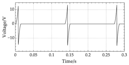 The selected device for this work is a miniature DC permanent magnet generator. The load resistor used in this work is 30 , which is approximately the same as the internal resistance of the micro-generator. The model of the micro-generator was simulated with MATLAB/Simulink. The relationship between the speed and time in Figure 9c was input to obtain an image of the micro-generator voltage with time, as shown in Figure 10. During the squeezing of the NEH-TPMS, the generator generates power in a positive direction. When the maximum deformation is reached, the voltage peaks at 13.28 V. The NEH-TPMS recovers from the deformation, and the spiral spring releases its stored energy, causing the shaft to rotate in the opposite direction and the generator to produce electricity in the opposite direction. Finally, the positive and negative voltage in both directions is rectified to convert the voltage to a single direction.