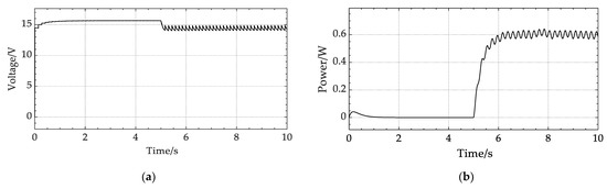 Simulation results after voltage regulation: (a) The relationship between time voltage; (b) The relationship between power and time.