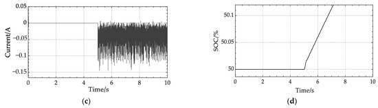 Simulation results for steady-state voltage and li-ion battery charging model: (a) Relationship between battery voltage and time before parallel capacitors; (b) Relationship between battery voltage and time with capacitors connected in parallel; (c) Relationship between battery current and time; (d) Relationship between battery SOC and time.