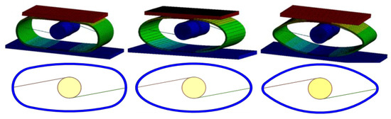 The elastic steel pipe is compressed in the vertical radial direction and stretched in the horizontal radial direction when the tire makes contact with the ground. Therefore, the rope is under tension. Utilizing the ANSYS LS-DYNA module [32], the process of pulling the rope is simulated. Board 1 represents a pressurized tire in contact with the ground. The cylindrical body imitates the rotating cylinder and the structure of transmission. Board 2 simulates the hub of the wheel. It is assumed that the tire’s contact area with the ground is rectangular. The following equation describes the relationship between the tire’s radius, , the length of the rectangular contact, , and the tire deformation variable, :