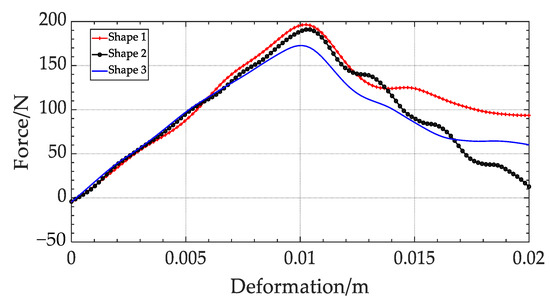 The graphics in Figure 15 were generated from simulations conducted using ANSYS. In the initial stage of tire deformation, the three shapes exert comparable pulling forces. However, at maximum deformation, Shape 1 exerts a pulling force of 196.4 N, while Shape 2 and Shape 3 exert pulling forces of 190.80 N and 172.8 N, respectively. The drawing force induced by the rope increases as the angle of rounding between the rope and the steel pipe increases. As the tire recovers its deformation, the pulling force of Shape 2 gradually returns to zero. However, Shape 1 and Shape 3 generate greater oscillation, which poses a greater barrier to the spiral spring’s release.