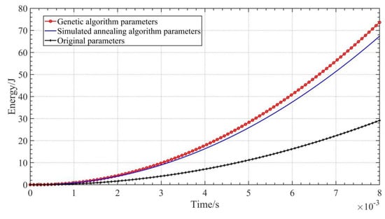 The optimal solutions of the two algorithms and the initially given parameters are brought into Equation (14). Figure 18 depicts the image of the energy storage of the spiral spring. The evolutionary algorithm-based optimal solution yields a peak energy storage of 73.66 J. The algorithm for simulated annealing yields a peak energy storage of 63.38 J for the ideal parameters of the spiral spring. This is a substantial increase in comparison to the energy storage before optimization. The ideal option found by the evolutionary algorithm enhances the energy storage capacity of the spiral spring by almost a factor of 2.5.