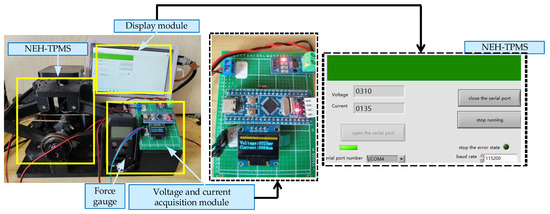 The experimental setup, as shown in Figure 19, mainly consists of the NEH-TPMS prototype, a voltage and current acquisition module, and a display module. The structure of the NEH-TPMS prototype is shown in Figure 20. Initially, the weight is placed on the load table. A force gauge is also supplied for recording the weight’s specific gravity. The object exerts downward pressure on the load table, simulating the process of a tire being compressed by the earth. At this stage, the lifting structure is compressed vertically and stretched horizontally, replicating the process of elastic steel pipe deformation under pressure. This pulls the rope, which turns the shaft. Simultaneously, the spiral spring is tightened to begin storing energy while the generator produces power. After the load is removed, the load table returns to its original location, restoring the length of the lifting structure to its original value. The energy released by the spiral spring propels the generator to produce electricity in reverse.