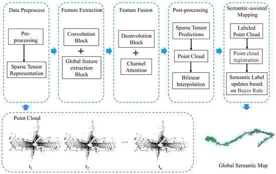 After prediction, the TSR-Net system transforms the sparse tensor-based raster representation into a point cloud and generates a semantic segmentation map of the local scene. After point cloud registration, the TSR-Net system updates semantic labels using Bayes’ rule and eventually obtains a global semantic map.