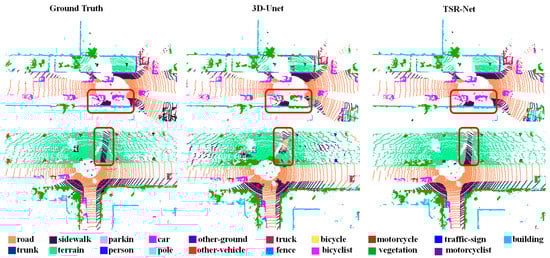 As can be seen from Table 4, the TSR-Net system has a high number of parameters but only about 65 G of computation, which is more than half the current low [8]. Although we increased the segmentation accuracy by adding global feature extraction and channel attention modules, thus increasing the number of parameters, the value of the FLOPs did not improve significantly. This is due to the fact that our system is based on a sparse tensor. The size of the computation in the system is related to the number of effective rasters in the convolutional layers. The computational effort of the system can be significantly reduced depending on the sparsity of the data.