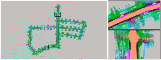 To visualize the real-time segmentation effect of the TSR-Net system, we constructed a global semantic map on the GTX 3090 server. Figure 4 shows the semantic map of our system for the SemanticKITTI dataset 05 sequence scenes. The left-hand side of the image shows a top view of the 05 sequence scene, and the right-hand side shows a zoomed-in view of each of the two partial scenes. During the construction of the semantic map, we censored the data of sequence 05 and updated the semantic labels by taking one frame from every three consecutive frames.