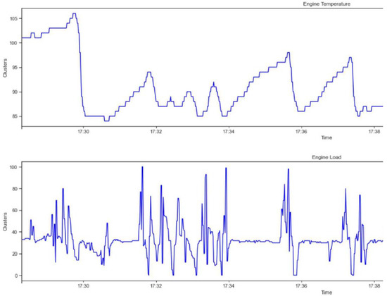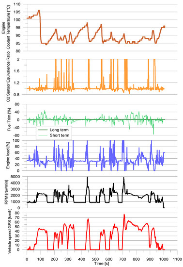 The data collected during the road tests could be displayed in the form of useful graphs. Such examples are shown in Figure 3. On the basis of the selected engine operation parameters over time, it was already possible to determine the correct operation of the internal combustion engine in the tested vehicle. Even more useful information could be obtained by subjecting the measurement data to processing using artificial intelligence.