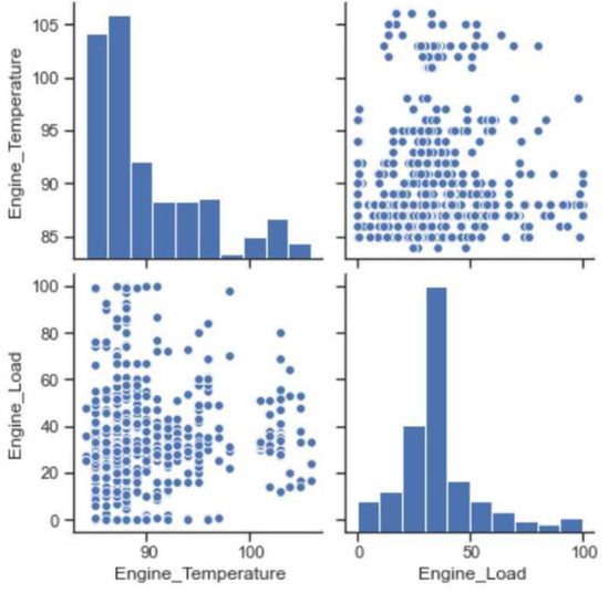 Figure 4 shows scatterplots of the relationship between the selected measured values as well as histograms. From the scatterplots, the range of measurement data could be instantly read and concentration of the measurement data in the entire field could be predefined. The histograms represented how often a given value occurred while driving. They showed that during road tests on the analyzed section, the engine worked in the entire load range from 0% to 100%, but the largest share was the work with an average load of 40%.