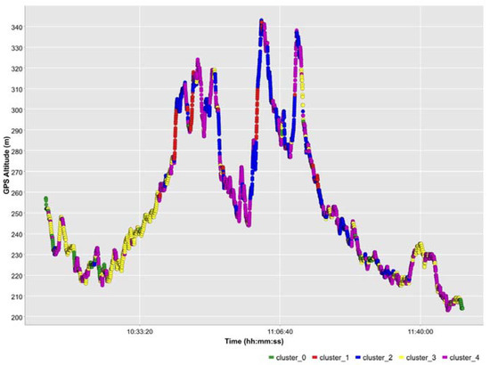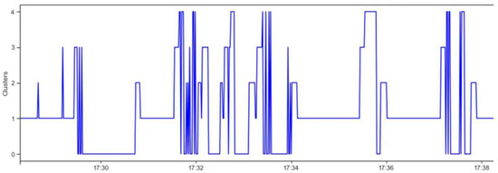 To perform computations using the Python library, it was decided to choose from 5 to 10 clusters that formed the state space of the analyzed process—in the first case, there were five different states in the process, in the second case, there were 10. The trajectory of the analyzed process ran through separate states and the process signature was defined as a trajectory in the state space. In fact, the signature of the route should be generalized, taking into account the context in which the survey takes place. It can be generalized in terms of the driver of the vehicle, the type of route, or the time of day. Driving can occur on the same route, but during or off peak times, on a weekday, or on the weekend [53,54].