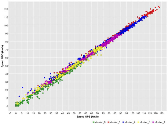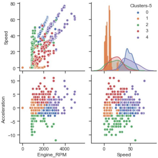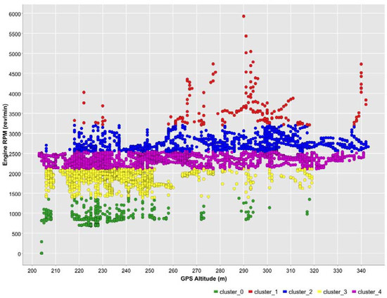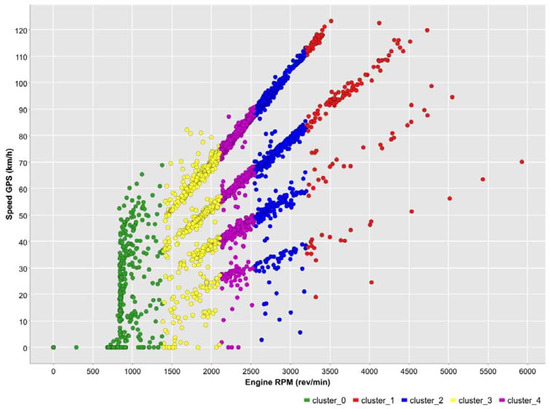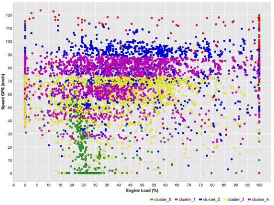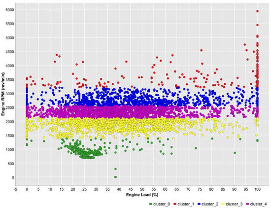 Data classification into five clusters (cluster numbers 0 to 4) is presented in Table 3. It is worth noting that the created clusters made physical sense. They could be attributed to terms commonly known in engine and automotive practice. For example, cluster 0 could be described as driving at a constant average speed of 44 km/h at an engine speed of 2231 rpm. Cluster 1 was defined as idling. This was indicated by the idling engine speeds and driving speeds close to 0 km/h. Cluster 3 included the strong acceleration that usually occurred when starting off and reaching speed in city traffic.