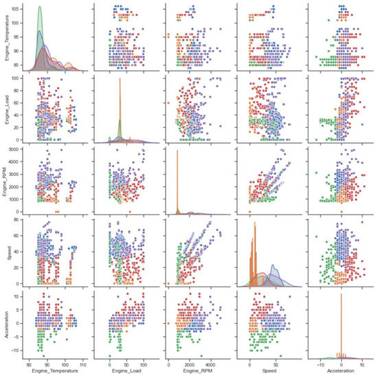 The appearances of the empirical densities of the probability distributions for individual states (clusters) are presented in Figure 8 and Figure 9. These graphs allowed us to easily detect the clusters defined in Table 3. Additionally, they were marked with appropriate colors. Cluster 0, corresponding to stable driving at medium speeds, was marked in blue. In the clusters of blue points, driving in individual gears could be easily observed. Cluster 1, defined as idling, was marked in orange. It was characterized by driving speeds close to 0 km/h and accelerations close to 0. However, expert knowledge was required for such an interpretation. The authors’ intention was to use artificial intelligence methods as much as possible in determining route signatures. The expert knowledge in the presented study was limited to the selection of the quantities defining the information space of the tested driving process, i.e., engine revolutions, driving speed and acceleration, as well as engine load.