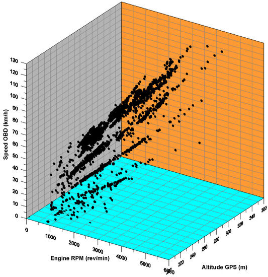 Data transmission from the OBD socket to the mobile device is usually wireless. Applications installed on a mobile device can perform calculations using the acquired data in real-time or perform the function of transferring data to the data cloud. Thanks to the built-in GPS functions, both vehicles and the mobile devices inside them enable very precise localization of the vehicle [45]. Thus, the data package obtained from a modern vehicle contains location data and all other data obtained from the OBD system [46]. They make it possible to accurately describe the location of the vehicle together with a description of its operating state. Such data are very often used for vehicle monitoring and tracking as well as for fleet management.