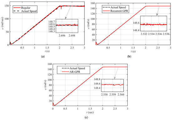 The result of the AR-GPR method of the speed estimation method is shown in Figure 6c, along with the actual speed. The performance indices graphs are shown in Figure 7 and Figure 8 illustrates that this method provides improved speed estimates compared to the regular GPR with the RMSE of ‘0.296’%. The recurrent GPR integrates the effect of present and past speed into the model. The ISE, ITSE, and RMSE illustrate that the autoregressive GPR technique improves the accuracy of speed estimation and leads to a much smoother motor speed. Mainly, the RMSE is ‘0.14’%, which is almost a perfect fit with the actual speed.