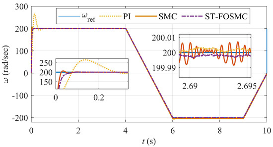 Speed response of PI, SMC, and the proposed ST-FOSMC.