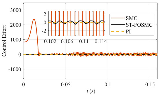 The speed response for overvoltage and under-voltage is shown in Figure 12b,c, respectively. At t = 1 s, the PI scheme shows an overshoot of 9.8 rad/s, undershoot of 10 rad/s, and settling time of t = 1.65 s for the overvoltage scenario. In contrast, it showed undershoot and overshoot of 10 rad/s and 35 rad/s, respectively, and settling time of t = 1.8 s for the under-voltage scenario followed by bulky transients. The ST-FOSMC control paradigm response is almost similar to SMC in this case. The SMC provided an overshoot of 7.5 rad/s and undershoot of 7 rad/s for the overvoltage case, whereas the ST-FOSMC provided an overshoot of 7 rad/s and undershoot of 5.5 rad/s, as shown in Figure 12b. Similarly, for the under-voltage case, the SMC provided an overshoot of 20 rad/s that is almost like the proposed ST-FOTSMC, whereas the SMC provided an undershoot of 13 rad/s and that of ST-FOTMSC is 11 rad/s, as shown in Figure 12c. Hence, it can be concluded that the proposed ST-FOSMC can eliminate the chattering problem in conventional SMC and robustness problems in conventional PI, improving the inherent robustness of SMC.