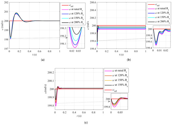 The robustness of the PI, SMC, and ST-FOSMC control paradigms to parameter variations were validated by varying the rotor resistance from rated resistance to 120%, 150%, and 200%. The PI controller has slow convergence and high transient oscillations, as shown in Figure 11a. The speed waveform for SMC under such conditions is shown in Figure 11b. The SMC is robust compared to the PI controller and shows fast convergence, less steady-state error, and transient oscillations. The speed response of proposed ST-FOSMC is shown in Figure 11c. The ST-FOSMC results validate that the proposed scheme is robust and insensitive to the load disturbance and parameter variation with fast settling time and minor steady-state error. The results show that the PI controller had slow convergence and high transient oscillations. On the other hand, the SMC controller demonstrated better robustness compared to the PI controller, with faster convergence, reduced steady-state error, and less transient oscillations. Moreover, the proposed ST-FOSMC controller was found to be highly robust and insensitive to load disturbances and parameter variations. The ST-FOSMC controller exhibited fast settling time and minor steady-state error, which makes it suitable for practical applications.