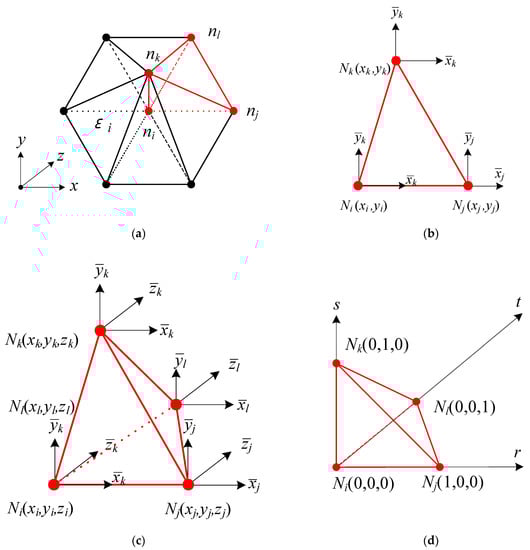 The enriched cover interpolation sub-domains that employ a standard triangular mesh (a,b) and tetrahedral mesh (c,d) for E-FEM: (a) The cover region () for enriched interpolation covers and the typical linear interpolation functions (b) Local coordinates and physical coordinates of triangular element nodes; (c) Displacement of tetrahedral element node after introducing basis function; (d) The natural coordinate system of the tetrahedral element.