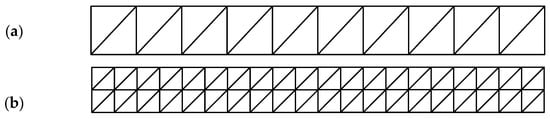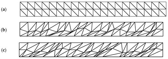Triangle mesh for cantilever beam in Figure 4: (a) Mesh a (10 × 1); (b) Mesh b (20 × 2); (c) Mesh c (40 × 4).
