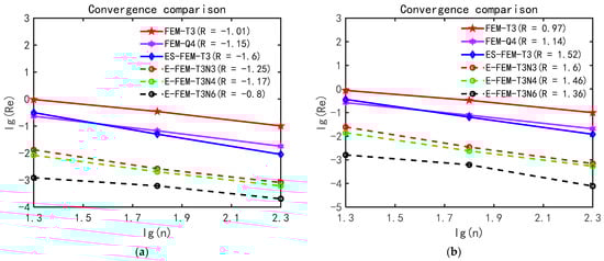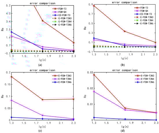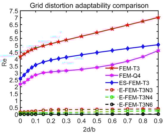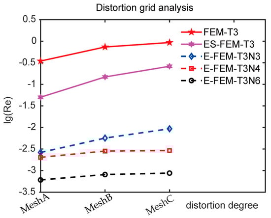 In practical engineering problems, grid distortion will also have a certain impact on calculation accuracy. The next sections further explore the capacity of the E-FEM-T3 to resist grid distortion.