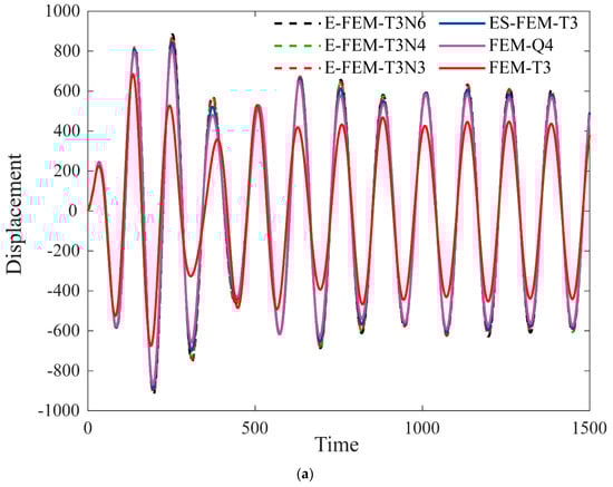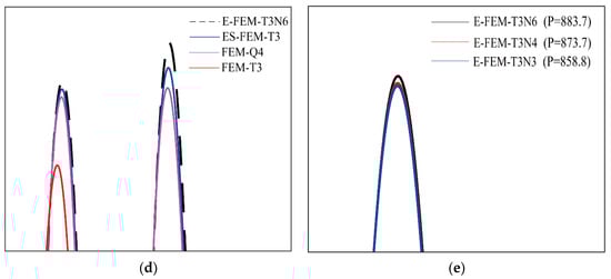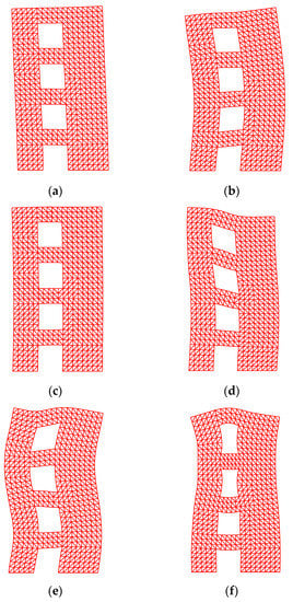 We can learn the following information by comparing relative errors of calculated frequencies, as shown in Figure 8 and Table 4. First, as deformation increases, the numerical error of the E-FEM-T3 does not vary significantly, whereas the numerical error of the FEM-T3 and FEM-Q4 varies. Secondly, the E-FEM-T3 curve is the lowest, with the smallest relative error. Thirdly, the error curves formed by FEM-T3 and FEM-Q4 follow a similar trend, with the error increasing when distortion parameters are increased. Fourthly, the curves of E-FEM-T3 are close to parallel lines, indicating that grid deformation has little effect on the error [36,37].