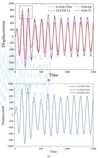 Figure 9 shows the two distorted grids established to assess the effect of grid quality on relative error. Three methods, FEM-T3, ES-FEM-T3, and E-FEM-T3, are shown in Table 5 and Table 6. The enriched K-matrix and M-matrix of proposed E-FEM-T3 often yield better accuracy than that of FEM-T3 and Quad 4. Even for distorted grids, good results can be obtained using E-FEM-T3 elements. This is a significant benefit of the E-FEM-T3 method. The result is valuable for the practical application of E-FEM-T3. Unlike the E-FEM method, E-FEM-T3 can yield better results; however, additional nodes are necessary to increase the stiffness matrix.