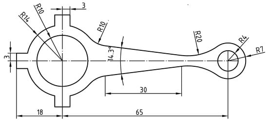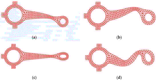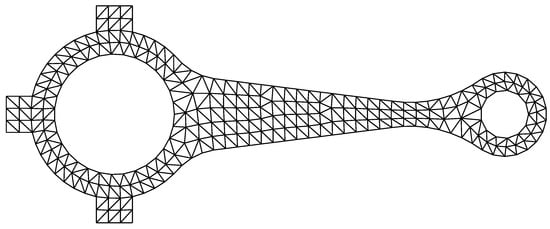 In this section, we performed a modal analysis of an automobile engine connecting rod to confirm the applicability of the proposed method. Figure 24 displays the geometric model of the connecting rod, and the small end of the connecting rod is a fixed constraint. The material parameters include GPa, , and kg/m3. The engine connecting rod is discretized into a grid model with 1045 nodes and calculated by three different numerical methods. Notably, the results of 78,526 nodes and 50,491 T-10 elements calculated by ANSYS [34,35] served as reference solutions.