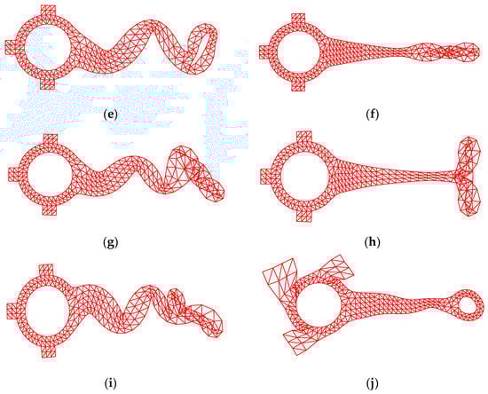 First 10 vibration modes of the connecting rod computed by E-FEM: (a) Mode one; (b) Mode two; (c) Mode three; (d) Mode four; (e) Mode five; (f) Mode six; (g) Mode seven; (h) Mode eight; (i) Mode nine; (j) Mode ten.