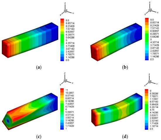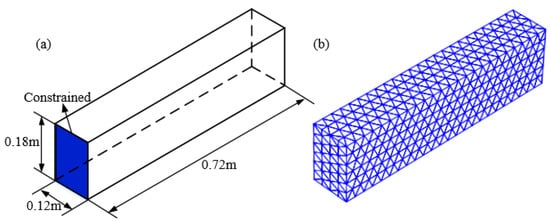 Figure 19 shows the structure diagram of the cantilever beam with the geometric parameter of 0.12 m × 0.12 m × 0.72 m. The blue area represents the constrained surface. In the current analysis, we used the following material properties in calculations: elastic modulus E = 70 GPa, Poisson’s ratio v = 0.33, density ρ = 2700 kg/m3. First, we analyzed the calculation accuracy, which was discretized into a grid model with 752 nodes (Figure 19b). For comparison, the model was discretized into an extremely fine mesh (71,771 nodes and 25,200 elements) in ANSYS to obtain the reference solution.