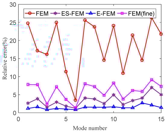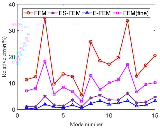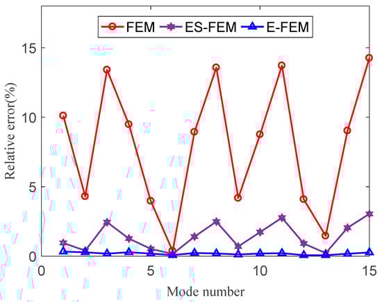 Table 9 shows the first 15 modal eigenvalues of the cantilever beam, and the relative error is shown in Figure 20, indicating the smallest relative error of E-FEM, hence the highest calculation accuracy among the three methods.