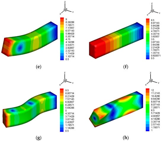 Calculation of the first 8 modes of a cantilever beam using E-FEM: (a) Mode one; (b) Mode two; (c) Mode three; (d) Mode four; (e) Mode five; (f) Mode six; (g) Mode seven; (h) Mode eight.