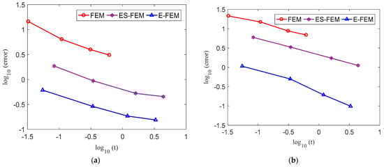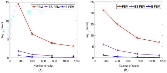 The current E-FEM will become the standard FEM, as demonstrated by Equations (2) and (5) if the polynomial bases utilized only have the constant term 1 (i.e., q = 0). From this vantage point, it is possible to think of the current interpolation of E-FEM as including additional higher-order terms in addition to the traditional FE interpolation. The higher-order interpolation of solutions can be achieved using this technique. As a result, even with lower-order linear elements, a higher convergence rate and better numerical solution accuracy can be obtained.
