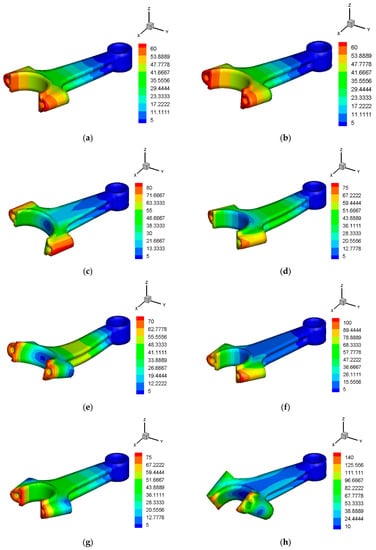 First 8 modal shapes of connecting rod calculated by E-FEM: (a) Mode one; (b) Mode two; (c) Mode three; (d) Mode four; (e) Mode five; (f) Mode six; (g) Mode seven; (h) Mode eight.