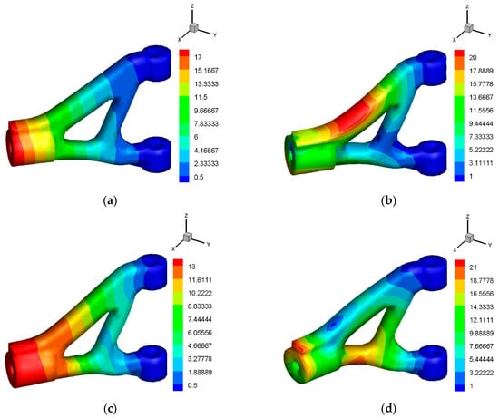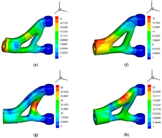 First 8 modes of automobile suspension arm calculated by E-FEM: (a) Mode one;(b) Mode two; (c) Mode three; (d) Mode four; (e) Mode five; (f) Mode six; (g) Mode seven; (h) Mode eight.