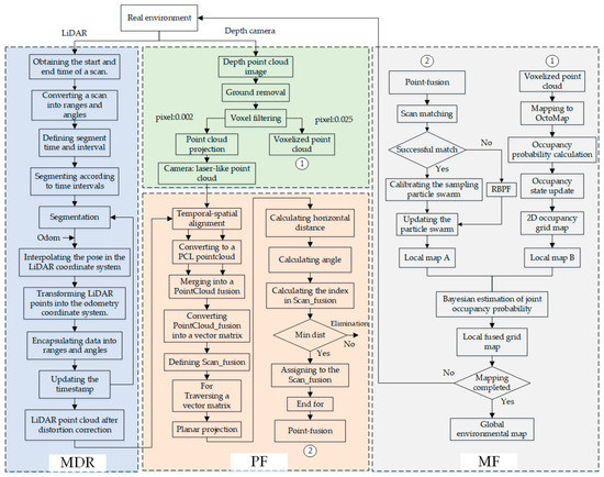 The MDR algorithm introduced in this research can serve as an integral component of data preprocessing, applicable to both conventional 2D and 3D LiDAR SLAM techniques, as well as LiDAR–visual SLAM methodologies. By optimizing the LiDAR odometer, the precision of the SLAM algorithm was effectively enhanced. This study presented experimental evidence to validate the feasibility of employing various MDR techniques in 2D LiDAR SLAM (specifically the Gmapping algorithm), and compared the performance of LiDAR-camera fusion SLAM (utilizing the PMF algorithm) with or without the inclusion of the MDR link.