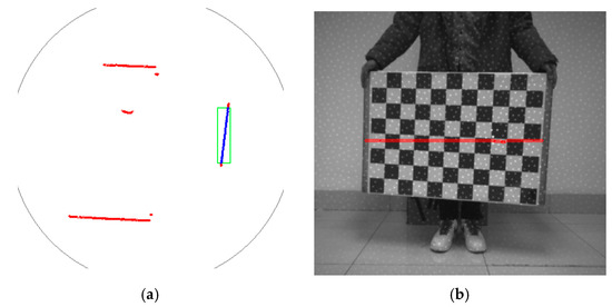 The joint calibration experiment was conducted using the Calibration Toolkit. Firstly, the calibration board was positioned in front of the quadruped robot dog, and Rosbag was launched to record data, while ensuring that the laser beam was precisely projected onto the calibration board, and the corner points in the camera image were clearly visible. Next, data playback was performed and the LiDAR point cloud mapped to the calibration board was labeled (the green box in Figure 4a identifies the area), with a total of 30 groups labeled. Then, the coordinate transformation result of the LiDAR and camera was solved. Finally, the accuracy of the calibration was verified by ensuring that the LiDAR point cloud could be accurately projected onto the calibration board. This verification process required all 30 sets of data to be correctly mapped, as shown in Figure 4b.