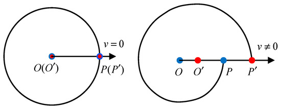 Figure 6 shows the phenomenon of motion distortion in the point cloud. In the figure, and represent the origin points of the LiDAR point cloud at the beginning and end of the emission of one frame, respectively, while and represent the starting and ending points of the scanning. When the velocity is 0, and coincide. However, when the robot dog is in motion, and are displaced.